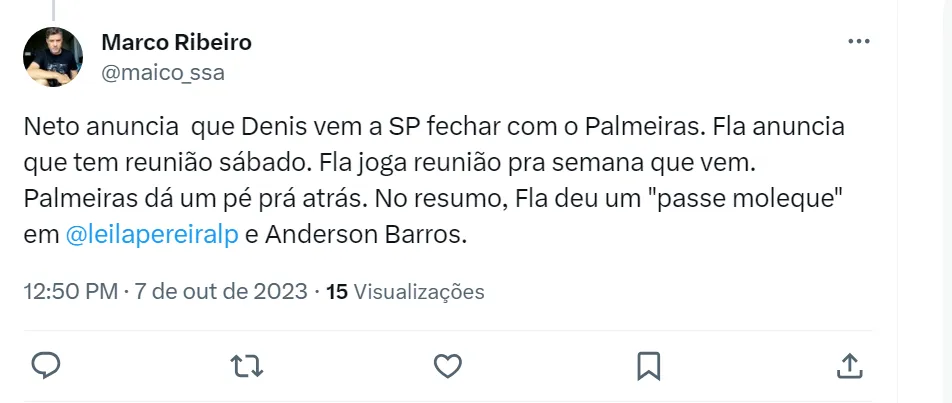 Porém, nada disso anima os palmeirenses. No Twitter, os torcedores estão afirmando que no final da história Anderson Barros vai ser atravessado no negócio e perderá a batalha pelo atacante Bruno Henrique, do Flamengo. Barros, inclusive, é muito criticado pelos palestrinos por sua atuação no comando do futebol do Clube Paulista.