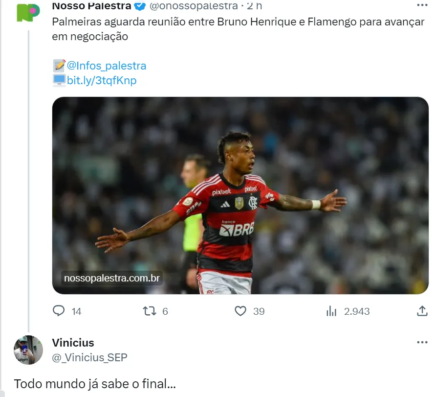 Dessa forma, a diretoria palestrina começa a planejar a próxima temporada e promete reforçar o elenco para 2024. No entanto, a torcida palmeirense não está confiante que isso vai acontecer. Hoje, saiu uma notícia do jornalista Venê Casagrande que a reunião entre Flamengo e empresário de Bruno Henrique, que aconteceria neste sábado (7), em São Paulo, foi cancelada e vai acontecer em outra data.