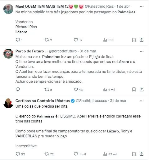“Internamente, no Palmeiras, há muitos elogios ao Lázaro, ele foi muito elogiado na entrada contra o Santos. É aquele tipo de jogador que muitas vezes o torcedor não entende por que ele foi contratado a peso de ouro vindo da Europa, o jogador volta para o Brasil para uma retomada de carreira, aí muitos torcedores falam: ‘contratou o cara, vai ficar no banco’?, iniciou o jornalista.