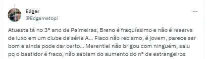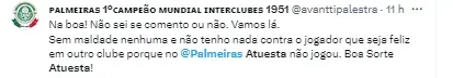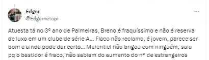 “Abel não enxerga Atuesta como um meia de armação, e, sim, como um segundo volante. E obviamente com Richard Ríos, Gabriel Menino, Zé Rafael, Aníbal Moreno e Fabinho, o espaço fica um pouco reduzido para o Atuesta”, afirmou Felippe.