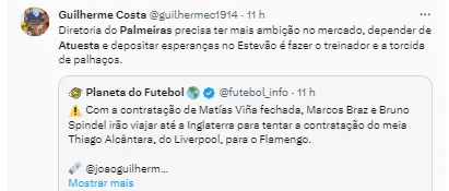 “Por outro lado, eu fui checar com o staff do Atuesta. E a resposta que veio foi a seguinte: até essa sexta-feira (19) não temos uma confirmação. Informação de que eles não sabem dessa história de que o Atuesta seria colocado à disposição por empréstimo”, finalizou o jornalista.