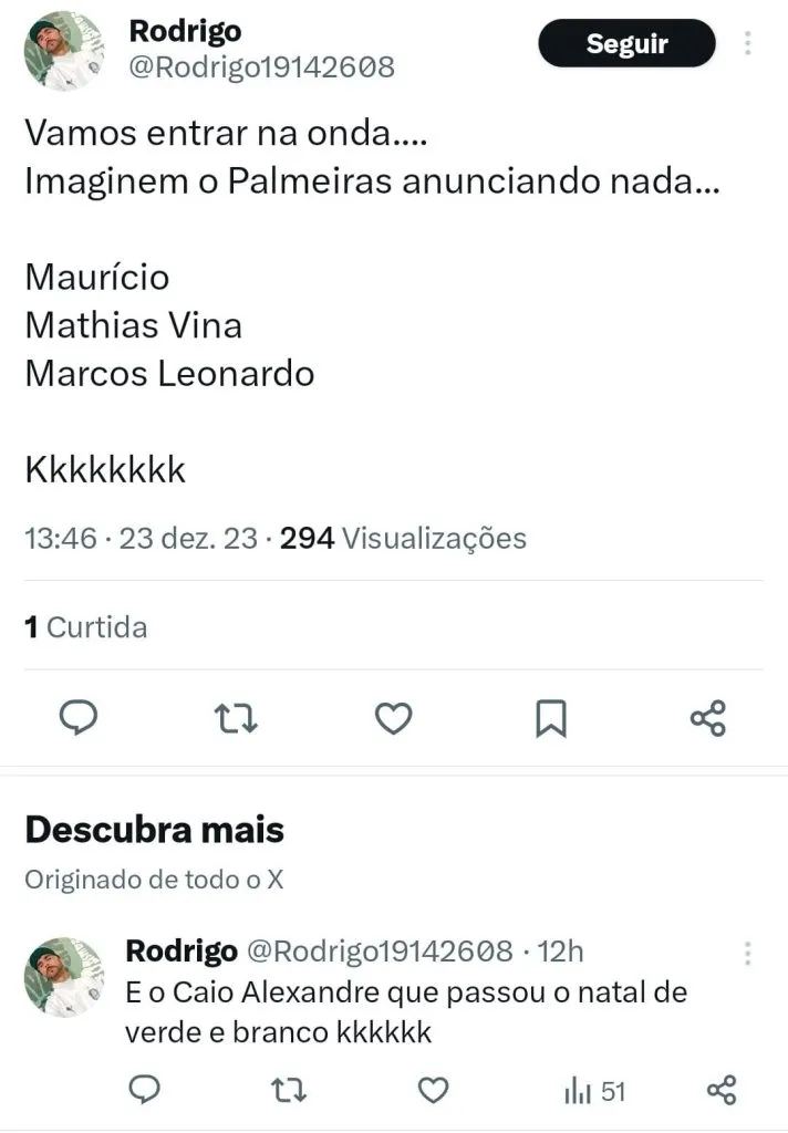 “Se o Palmeiras contratar Marcos Leonardo, Matías Viña e Maurício eu boto o nome dos meus filhos de Anderson Barros e Leila Pereira. #promessa”, prometeu outro.