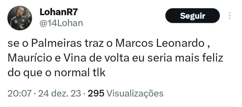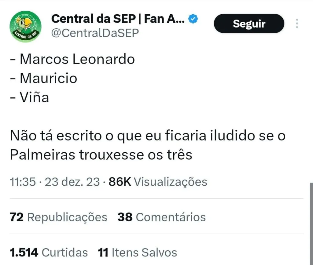 “Era só Marcos Leonardo, Maurício e Viña no Palmeiras nessa janela de transferências e a gente arrastava TUDO!!!”, declarou um torcedor via ‘X’, antigo Twitter.