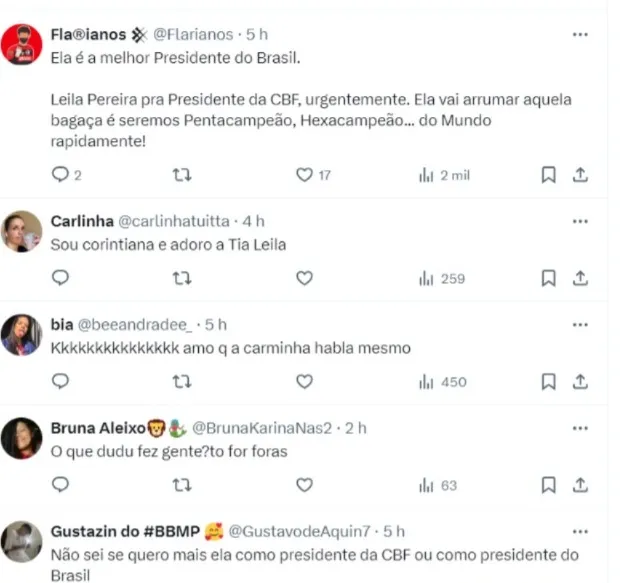 “Ela é a melhor Presidente do Brasil. Leila Pereira pra Presidente da CBF, urgentemente. Ela vai arrumar aquela bagaça é seremos Pentacampeão, Hexacampeão… do Mundo rapidamente!“, completou outro torcedor.