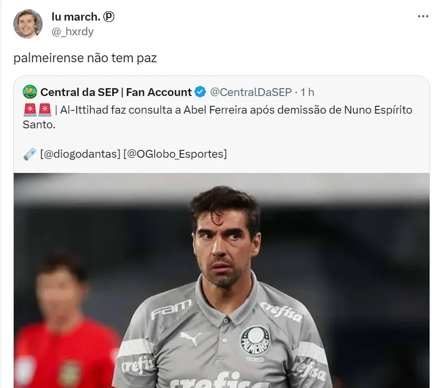 O treinador Abel Ferreira, que está no Palmeiras desde 2020, recebeu uma sondagem no mercado. Uma vez que o Al-Ittihad, da Arábia Saudita, manifestou interesse em contratar o português.