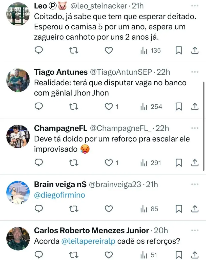 “Quando o Veiga for para a seleção, por exemplo, temos dois jogadores que podem fazer essa posição, o Luis e o Jhonatan. Se não vier ninguém, eles que vão jogar”, acrescentou.