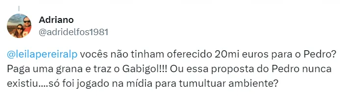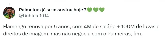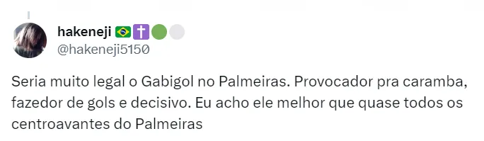 “Por que não pega o Gabigol? Ué, pega o Gabigol. Ele está fácil. No meio do ano ele vai assinar um pré-contrato, você acha que o Flamengo não vai querer dinheiro? Eu se fosse a Leila iria atrás do Gabigol, imagina o Gabigol no Palmeiras?”, questionou Benja.