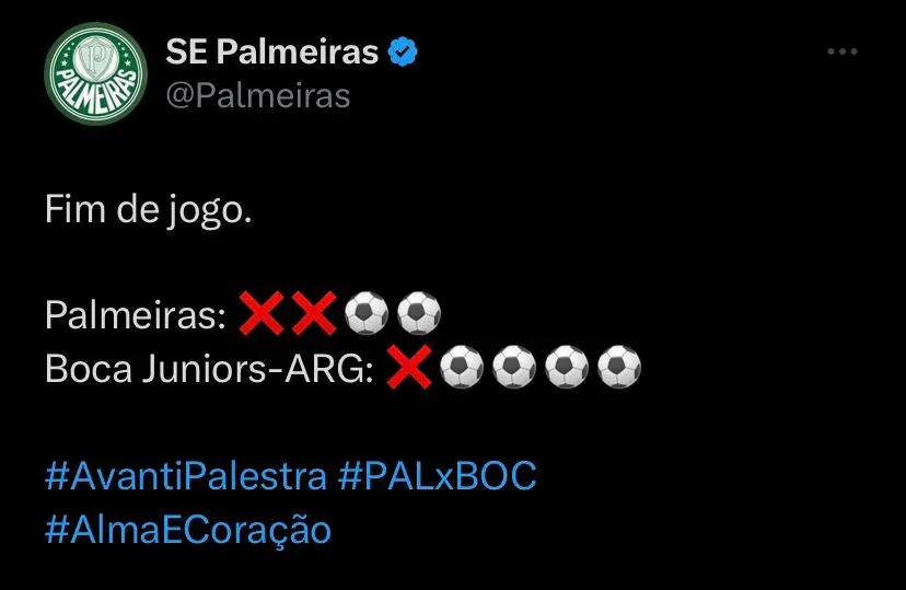 O Boca Juniors abriu o placar ainda na primeira etapa, com Cavani marcando o seu primeiro gol na Copa Libertadores após linda jogada de Merentiel, que está emprestado pelo Palmeiras ao clube argentino. Na volta do intervalo, Abel Ferreira colocou Endrick e Kevin, que deram mais velocidade ao ataque e souberam explorar isso muito bem ao decorrer da partida. Com a expulsão de Roja, o Verdão passou a ter mais a posse da bola e com um lindo chute de fora da área, Piquerez empatou a partida, que terminou empatada em 1 a 1 e a vaga foi decidida nos pênaltis com o Boca Juniors levando a melhor.