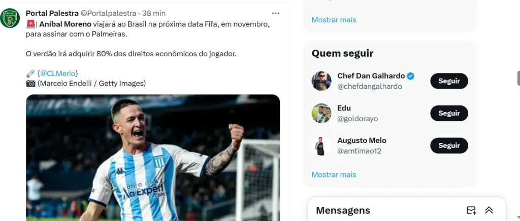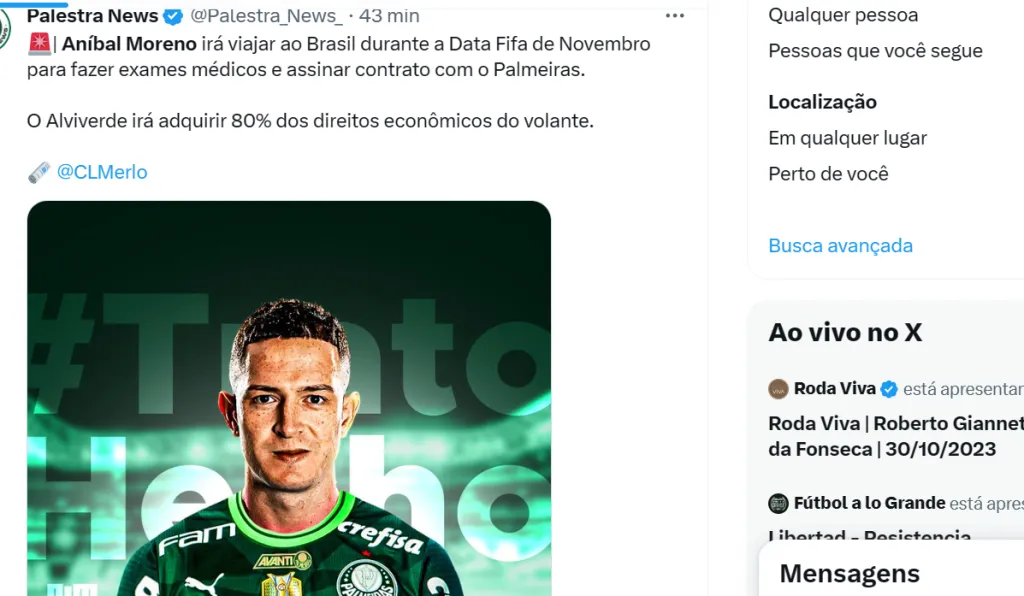 E se em 2023 Leila só trouxe Richard Rios e Artur, o primeiro reforço para o próximo ciclo deve ser Aníbal Moreno. O volante do Racing viajará a São Paulo durante da Data FIFA em novembro, de 13 até 21/11.