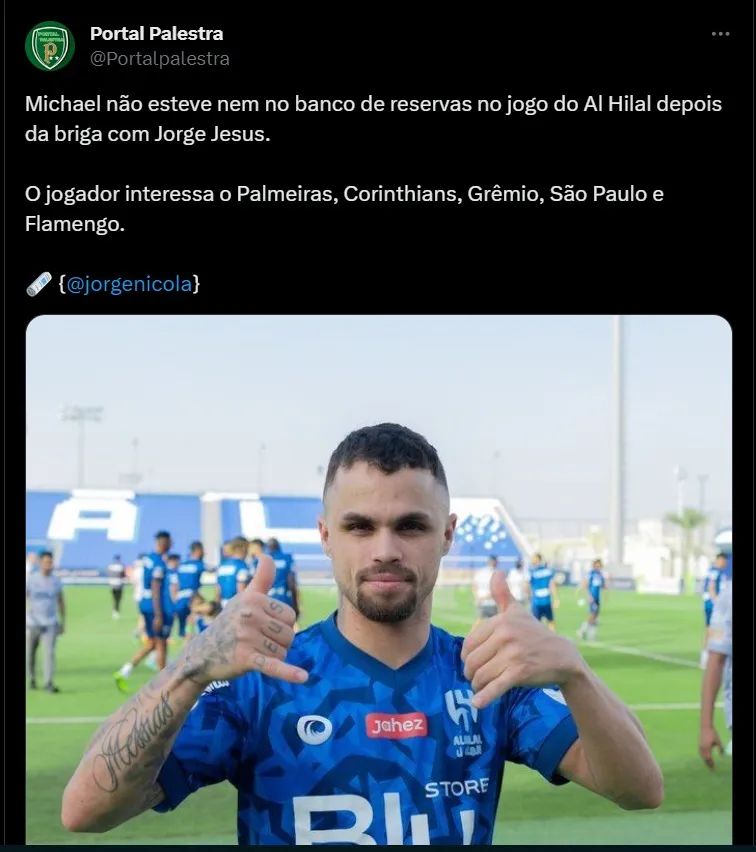 Aos 27 anos, o jogador tem contrato até junho de 2025 com a equipe saudita, mas havia externado o desejo de retornar ao Brasil. Mas o alto valor acaba sendo um empecilho para essa negociação. Entretanto, uma mudança de cenário nos bastidores do Al-Hilal pode ajudar o Alviverde nesta negociação. Michael se envolveu em uma confusão com o técnico Jorge Jesus, após demonstrar frustração quando foi substituído na partida.