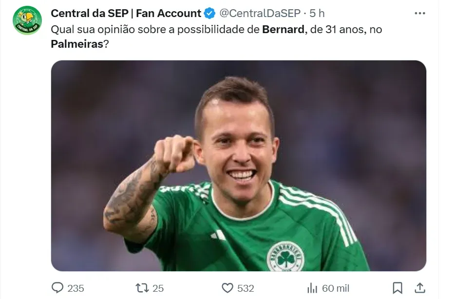 O contrato do ponta de 31 anos expira na metade de 2024 e o jogador está aberto a voltar ao Brasil. O próprio Atlético-MG e o Corinthians monitoram o atleta, mas, segundo o colega Lucas Tanaka, o Palmeiras é quem mais se mostra entusiasmado de momento.