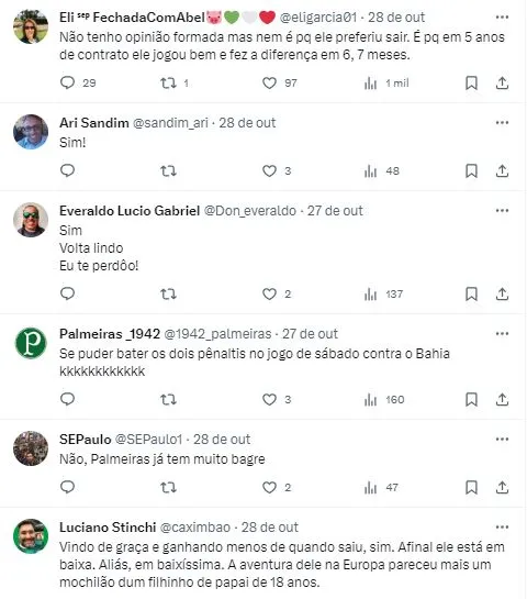 “Procurei minha fonte no Palmeiras para perguntar se Scarpa está na pauta. A resposta veio através da frase: ‘Posso garantir que não tem nada em andamento sobre o Scarpa agora. Sondamos no meio do ano, mas ele foi para a Grécia e não falamos mais no assunto’.“, afirmou Nicola.