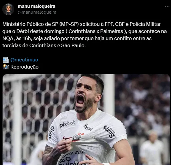 De acordo com o GE, o Ministério Público de São Paulo enviou um ofício à CBF para recomendar o adiamento do clássico, visto que a capital paulista terá o duelo entre São Paulo e Coritiba, no Morumbi, além da final da Copa Pioneer, no Allianz Parque, torneio de várzea em que são esperadas 40 mil pessoas, e o festival The Town, em Interlagos, com público previsto de 100 mil pessoas.