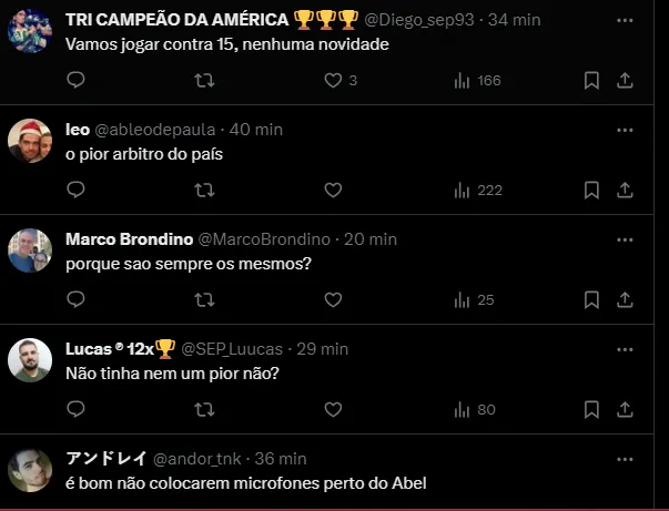 Muitos palmeirenses não gostaram dessa escolha da CBf e criticaram a entidade nas redes sociais: “Se a gente tinha alguma chance de ganhar, essa chance acabou”, “Vamos jogar contra 15, nenhuma novidade” e “Esse é ruim com folga”, foram alguns dos comentários.