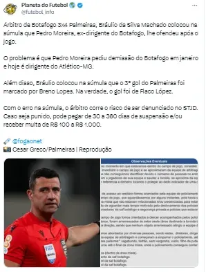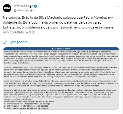 Um erro cometido pelo juiz Braulio da Silva Machado foi confirmado e pode gerar uma punição. Ele errou ao citar o nome de um dirigente do Botafogo que teria o ofendido. Na súmula, ele cita que Pedro Moreira teria o ofendido na saída de campo, mas o problema é que ele deixou o Botafogo no começo do ano e atualmente trabalha no Atlético-MG.