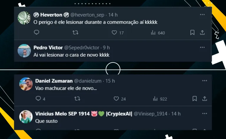 Por fim, vale mencionar que foram duas lesões que Bruno Rodrigues teve nos dois joelhos. Até pela reincidência, o Clube da Pompeia trabalha sem prazos, ou seja, sem necessidade de acelerar o processo. Veja os comentários da torcida ligando o “alerta”: