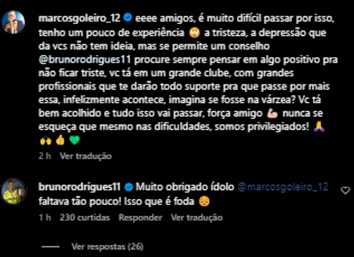 “É muito difícil passar por isso, tenho um pouco de experiência. Se me permite um conselho Bruno Rodrigues, procure sempre pensar em algo positivo para não ficar triste. Infelizmente acontece, imagina se fosse na várzea? Tudo isso vai passar, força amigo”, escreveu Marcos. Bruno Rodrigues respondeu.
