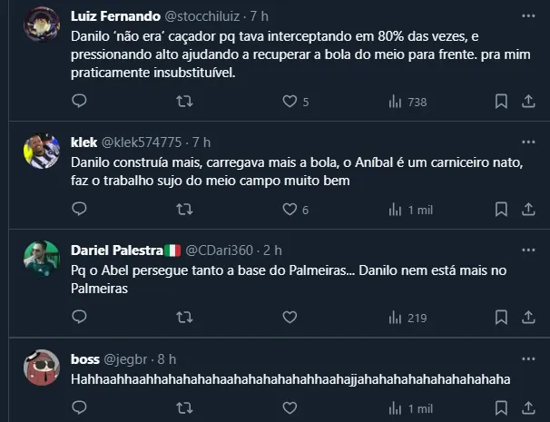 “Ele (Aníbal) tem uma coisa que o Danilo não tem. Ele é caçador, constrói e caça. Eu gosto desse tipo de jogador“, disse Abel na coletiva de imprensa, o que atiçou o torcedor nas redes.