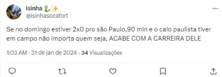 “Se já não era bom, sua estreia insegura e com críticas que o destruíram nas redes sociais, mexeram com o emocional dele que acionou amizades no RJ. Como todos sabem que somos sãopaulinos, ouvimos e obviamente, não vamos ofender o atleta que já é passado mas é notório na vida que ‘Fez a fama, deite na cama’”, postou, antes de finalizar: