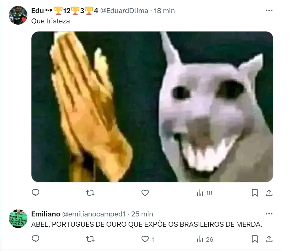 Durante a confusão no vestiário do Morumbis, Belmonte disse: Safado do c…! O Abel apitou para vocês, este português de me**”. O treinador do Palmeiras não gostou nada do que ouvir e deseja punição ao dirigente.