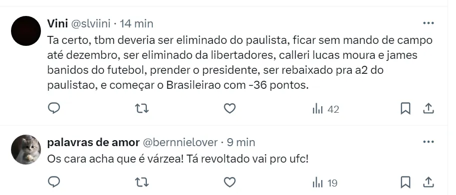 Vale lembrar que Calleri não atuou contra o Palmeiras, suspenso, mas revoltado com os acontecimentos do Choque-Rei, decidiu ir tirar satisfação com a equipe de arbitragem. Jogadores e dirigentes são-paulinos precisaram ser contidos pela Polícia Militar, segundo relatou o Globo Esporte.