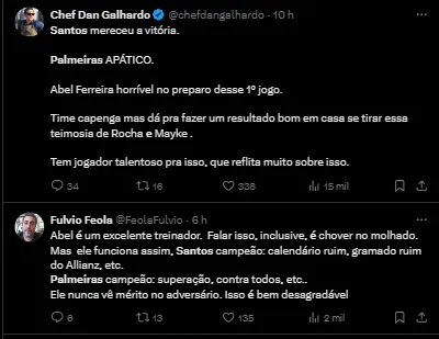 O comandante destacou que a equipe de Abel Ferreira buscou o jogo e teve intensidade em campo, também podendo conseguir um resultado melhor na partida, pois criou chances. “Se tivéssemos caprichado mais, poderíamos ter feito outro, mas, por outro lado, o Palmeiras criou também. Bola área, buscando o lado o tempo todo. É um jogo consistente do Palmeiras o tempo todo”, avaliou Fábio.