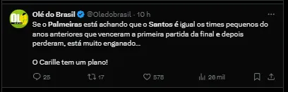 Carille também relembrou outra situação. Em entrevista recente, o treinador santista afirmou que queria enfrentar o Palestra na final. Foi exposto que esse papo existiu no vestiário. “Falei para todos no vestiário, para a parte diretiva, que queria chegar na final contra o Palmeiras e aconteceu”, revelou o treinador.