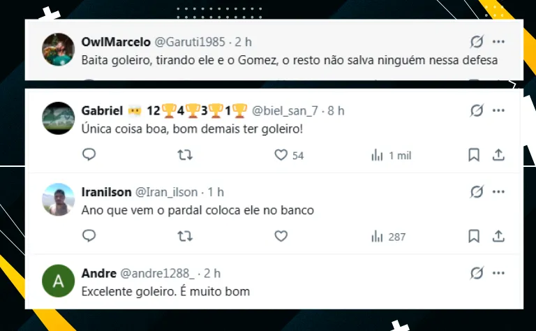 Para encerrar, de acordo com o Sofascore, o arqueiro palestrino realizou nove defesas no jogo, sendo quatro finalizações na área. Não à toa, recebeu diversos elogios dos palmeirenses na web: