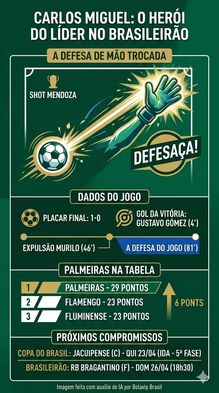 Já no segundo tempo, quando o time estava com um jogador a menos, pois o zagueiro Murilo havia acabado de ser expulso, Carlos Miguel fez uma defesaça de mão trocada, em um belo chute impedindo o gol do Athletico em finalização do colombiano Mendoza.