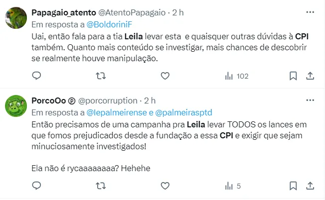 E também o jogo da virada histórica do Palmeiras sobre o Botafogo, por 4 a 3, no Nilton Santos, em novembro do ano passado. Pelo nome do Clube estar envolvido em reiteradas manifestações de Jhon Textor, Leila Pereira foi convocada a depor na CPI.