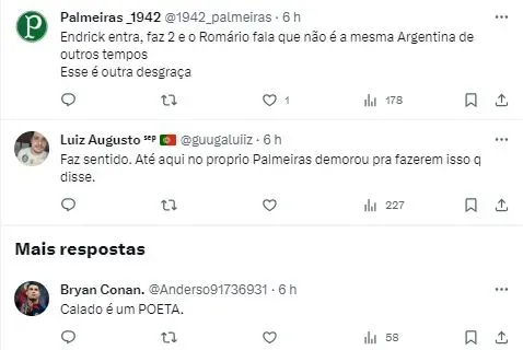 Romário entrou elogiou muito a jornada de Endrick, e falou o que pensa sobre sua possível titularidade: A Seleção Brasileira, (no jogo contra a Argentina), não vai ter a referência. Por exemplo, esse garoto do Palmeiras, o Endrick, é um bom jogador, tem um grande futuro, sabe fazer gol”, iniciou o senador.