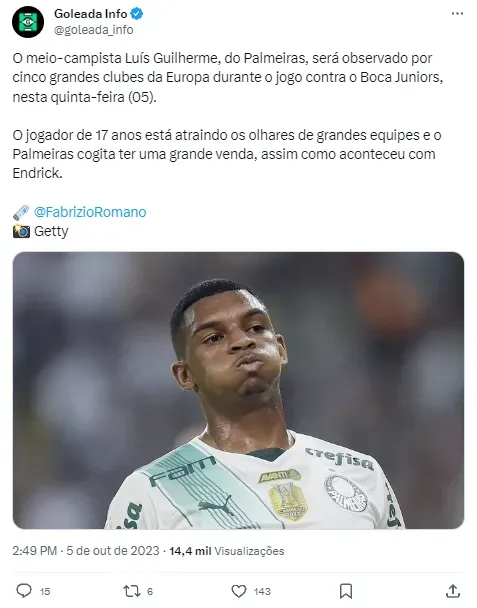 Isso porque segundo o jornalista italiano Fabrizio Romano, olheiros de cinco grandes clubes da Europa estarão de olho na semifinal com o Boca Juniors com o intuito de analisar Luis Guilherme. Com apenas 17 anos, o menino formado na Academia de Futebol já atrai olhares do Velho Continente e uma transferência é tida como questão de tempo na visão dos adeptos palestrinos. Quem não quer pensar nisso é Abel, que está focado na classificação.