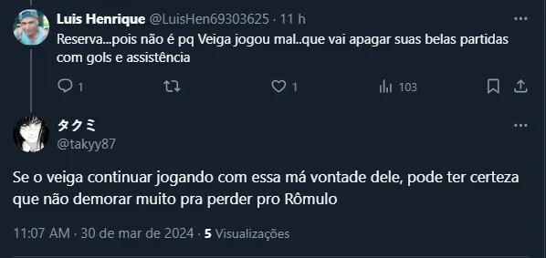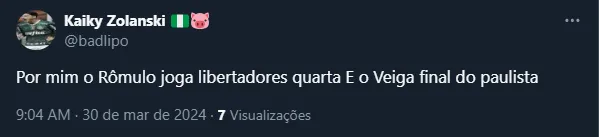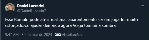 Além disso, o camisa 23 vem recebendo algumas críticas e sendo alvo de pedidos de mudança no time de Abel. Não à toa, a chegada de Rômulo “atiçou” alguns palmeirenses, que resolveram se manifestar na web.