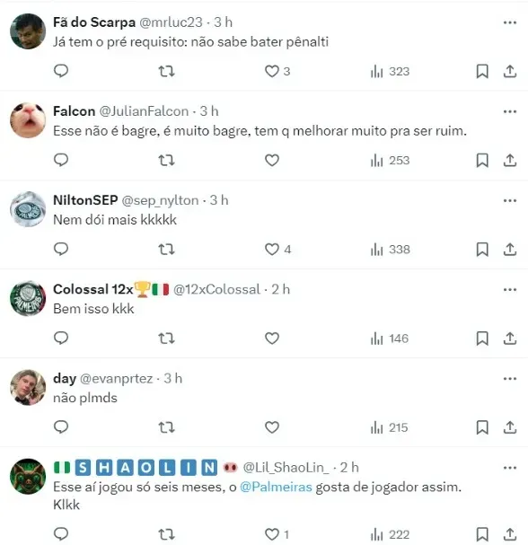 “Vem ser feliz no Verdão. Aqui estamos acostumados com jogador perdendo pênalti”. “Abel ia ter que trabalhar muito o mental dele, no Botafogo que só disputou o brasileiro não consegui manter o mental, imagina no Palmeiras que disputar tudo e ainda assim é muito cobrado”.