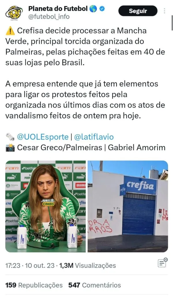 “Esses atos de vandalismo contra 40 lojas de uma patrocinadora que só colaborou com o Palmeiras, em momentos dificílimos, inclusive na pandemia. A maioria dos patrocinadores cortaram investimentos, suspenderam patrocínios. Em nenhum momento, nós suspendemos pagamentos para o Palmeiras, por isso conseguimos manter os empregos dos colaboradores. Ninguém foi demitido na época da pandemia, Crefisa continua honrando religiosamente os pagamentos. Torcedor organizado não pensa no Palmeiras, torce pela entidade deles. Se torcesse pelo Palmeiras, não atacariam um patrocinador que está aqui só para ajudar. Se gostassem, não vandalizariam muros do clube. Vandalizam aquilo que amam? Conversa fiada, dogmas do futebol que precisam ser discutidos e rechaçados. Crefisa vai processar a torcida organizada que vandalizou as lojas, cível e criminalmente”, garantiu.