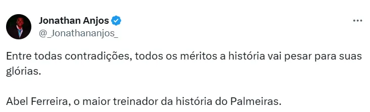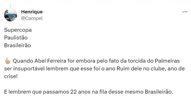 Enquanto isso, um dos assuntos mais falados nos bastidores do clube é a possível saída de Abel Ferreira, que estaria na mira do Al-Sadd, do Catar. Assim como o Palmeiras, o próprio Abel não se pronunciou sobre os rumores.