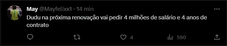 Aos 33 anos, um contrato longo para BH, que atua como um ponta em campo é um risco. Mas, buscando seduzi-lo, já que o Flamengo quer dar apenas dois, o Palmeiras optou em assumir o risco para ter o jogador. Entretanto, toda essa movimentação no mercado e facilidade para ceder na negociação vem gerando incômodo em um dos principais jogadores do elenco. Isso porque, Dudu não encontrou a mesma facilidade quando estava negociando a extensão de contrato com o Clube.