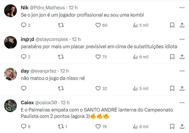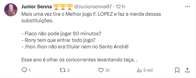 Com todo o rendimento que nós temos, e nós temos que perceber que por mais que queira ter o Luis (Luís Guilherme), o Luis… temos que dar tempo, o próprio Jhonatan temos que dar tempo, mas não vou voltar a referir o que já disse anteriormente”, disse o treinador, se referindo aos meninos que vieram da base.