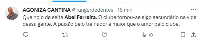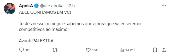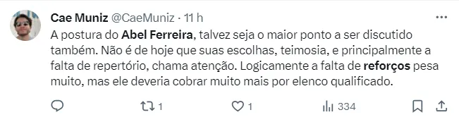 Ainda após a partida, Abel chegou a ser questionado sobre reforços na temporada, e citou uma posição em específico que gostaria de contar com mais jogadores: a função de meio-campo, um ‘camisa 10’.