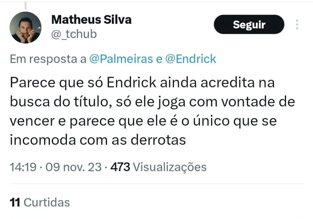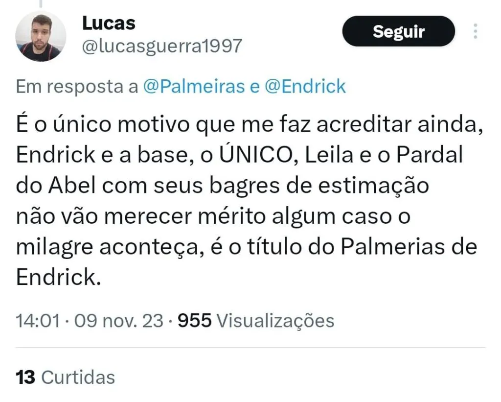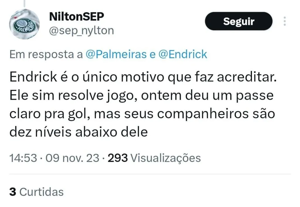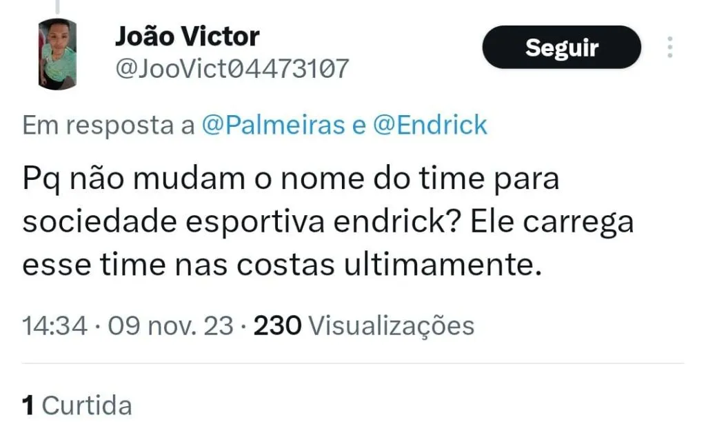 Segundo Arnaldo, Endrick é o principal responsável pelo momento da equipe. “Se o Suárez colocou o Grêmio na briga, o Endrick colocou o Palmeiras na briga, não é exatamente o trabalho do Abel nesse momento nesse campeonato de altos e baixos.”, disse durante o Posse de Bola.