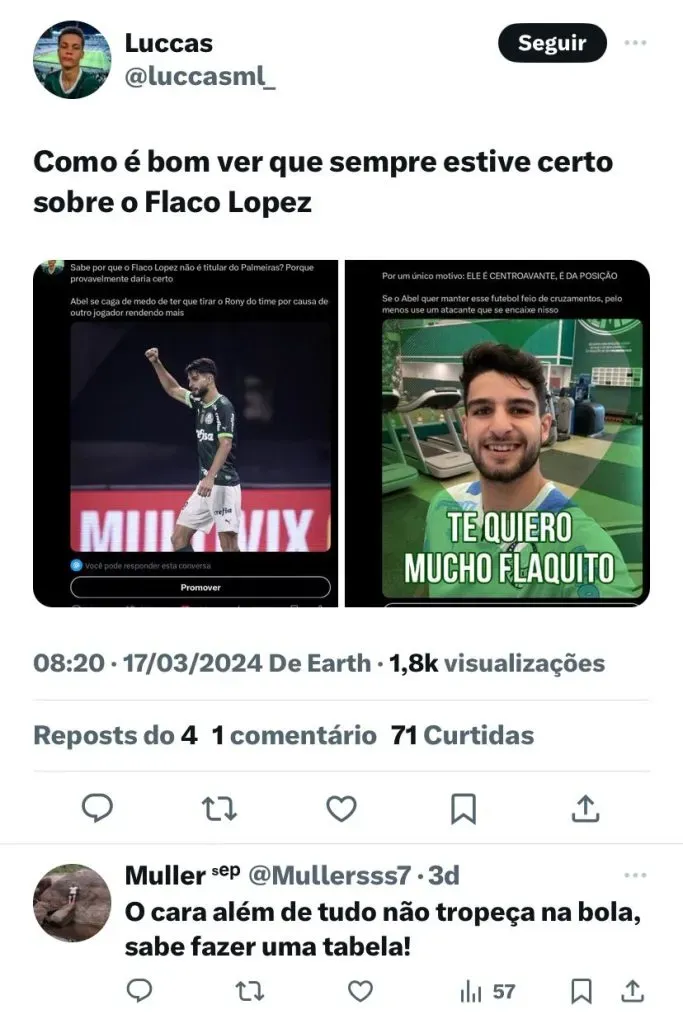 Caso mantenha a média atual, ainda tem chances de Flaco ultrapassar Rony, que do atual elenco é o único que conseguiu fazer uma temporada mais artilheira. Em 2022, ele terminou o ano com 22 gols. Nas mãos do português, o jogador caiu nas graças da torcida, com a confirmação do futuro do treinador, o atleta também tem mais garantias no Alviverde.