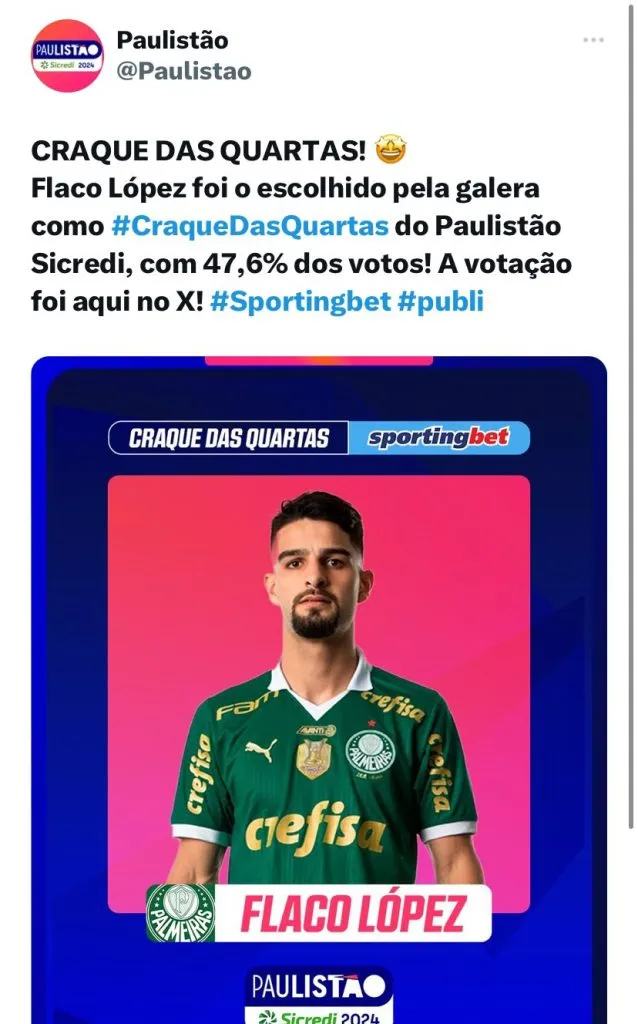 Trata-se do argentino Flaco López, que anteriormente passou por uma fase mais turbulenta, sendo alvo constante das criticas da torcida, mas que agora deu a volta por cima e é um dos destaques do ano até aqui. Inclusive, é esperado vê-lo em campo contra o Novorizontino, time de Eduardo Baptista.