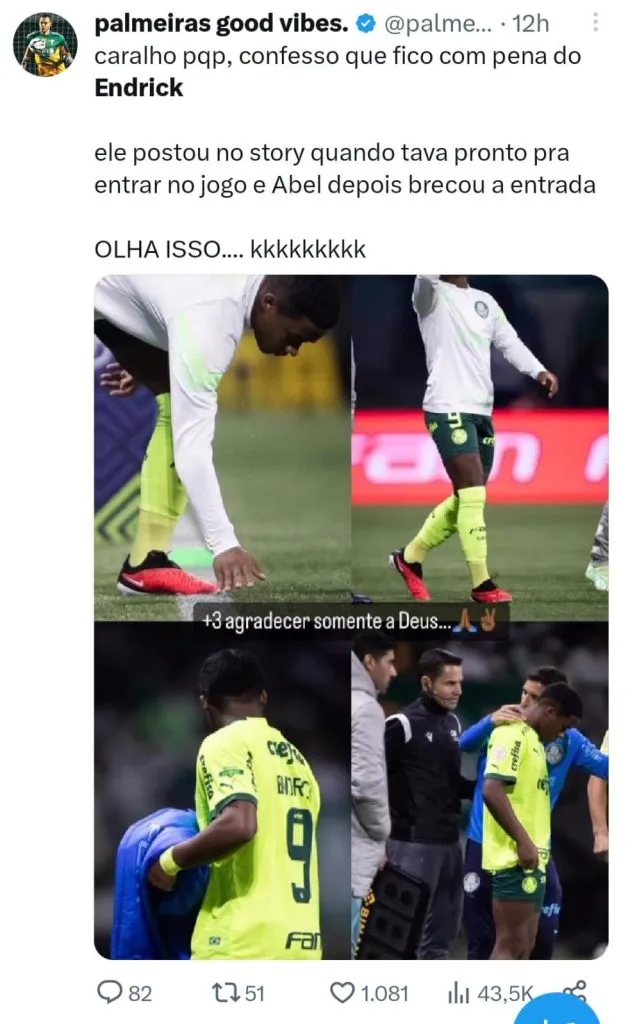 O jornal AS mostrou preocupação com a falta de continuidade de Endrick e ainda pontuou que o atacante não foi bem quando acionado por Abel e que momento de destaque acabou sendo sua expulsão no duelo contra o Atlético-MG, quando ao menos saiu do banco. “A falta de continuidade do garoto começa a ser preocupante. Ele participou de apenas dois dos últimos nove jogos de seu time, e só em um deles foi titular”, complementou.