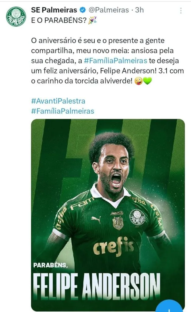 Nas últimas horas Felipe Anderson foi anunciado como novo reforço do Palmeiras, o meia assinou um pré-contrato até 2027, quando terá 33 anos, Anderson vive um momento bom com a camisa da Lazio e tem participações em gols que tem ajudado o time.