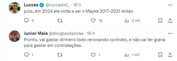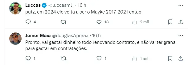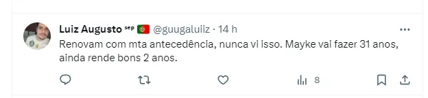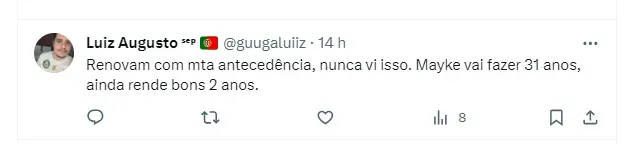 A cúpula alviverde deseja se movimentar logo porque no meio do ano que vem, Mayke já poderia assinar um pré-contrato com outra equipe. Além dele, outro atleta que tem contrato se encerrando em 2024 é o goleiro Weverton.