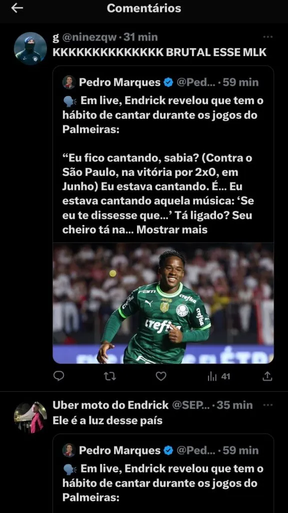 Endrick deu continuidade afirmando que ele canta durante o jogo, ai Coringa questionou ele se ele cantava no meio dos jogos e o camisa 9 confirmou: “É.. Ontem eu estava cantando: ‘Se eu te disse que… Tá ligado? Seu cheiro está na minha cama…”.