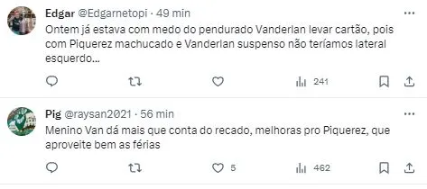 Piquerez não perdeu tempo e na reapresentação desta segunda-feira (4), iniciou o tratamento em seu joelho. Vanderlan, por sua vez, como apontou o Nosso Palestra, deve ser escalado em um esquema com três zagueiros, o que deixará a cria como uma opção livre para apoiar o sistema de ataque do Verdão.