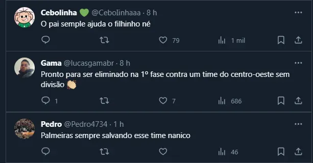 Não à toa, o fato de ser “classificado” o Corinthians à Copa do Brasil causou um incômodo enorme na torcida alvinegra. Além disso, os palmeirenses não perderam a chance de provocar os rivais por conta da ajuda.