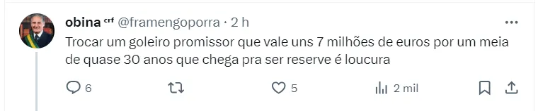 De acordo com informações de Julio Miguel Neto, o Rubro-Negro estaria disposto a envolver o goleiro Matheus Cunha para obter sucesso na contratação. O clube inglês já demonstrou interesse no arqueiro, o que facilitaria um acordo entre as equipes.