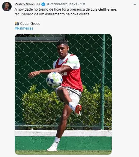 Nos trabalhos realizados na Academia de Futebol Alviverde, o meia-atacante Luis Guilherme voltou a treinar junto com o elenco, sem restrições. A Cria palestrina ficou afastado há mais de um mês por conta de um estiramento na coxa direita. Contudo, a última partida que Luis Guilherme aconteceu contra o Cruzeiro, no dia 14 de agosto, desde então, foram seis jogos desfalcando o Maior do Brasil.